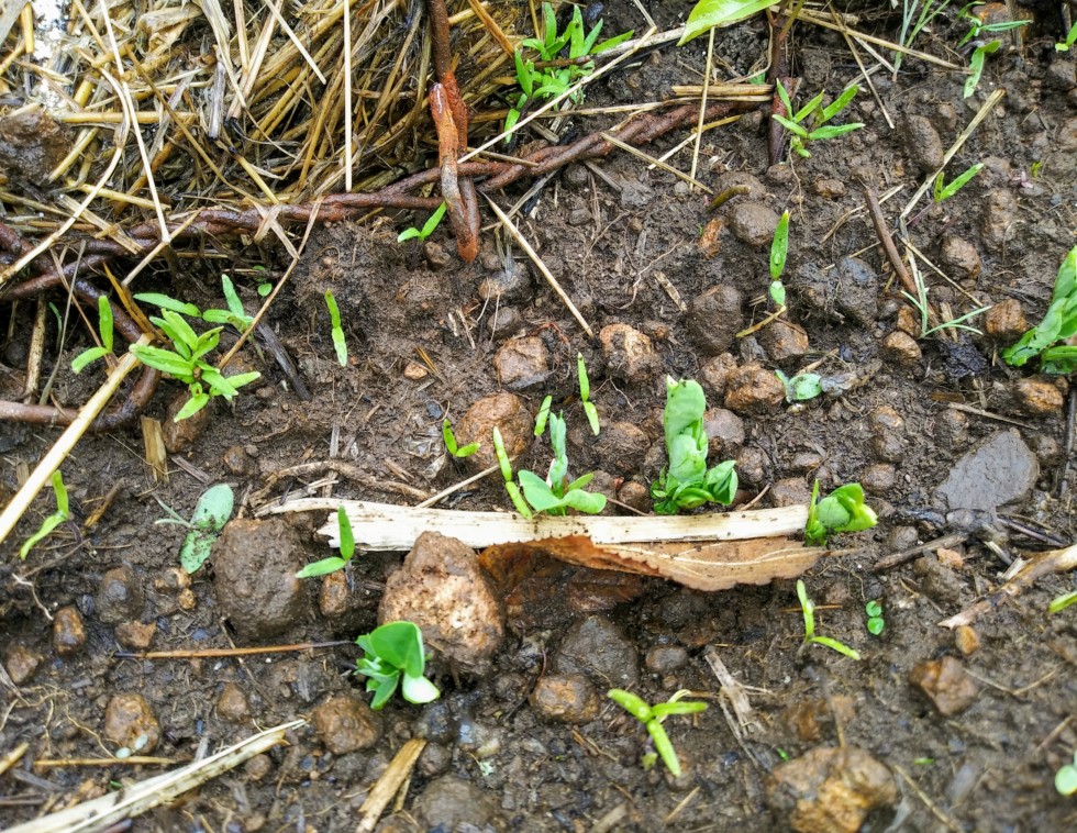 I think I am spending too much time on bp but then I find something unexpected and have to post it. Peas finally came up... But the surprise is I am already seeing volunteer tomatoes coming up. In fact these are ahead of my indoor starts.