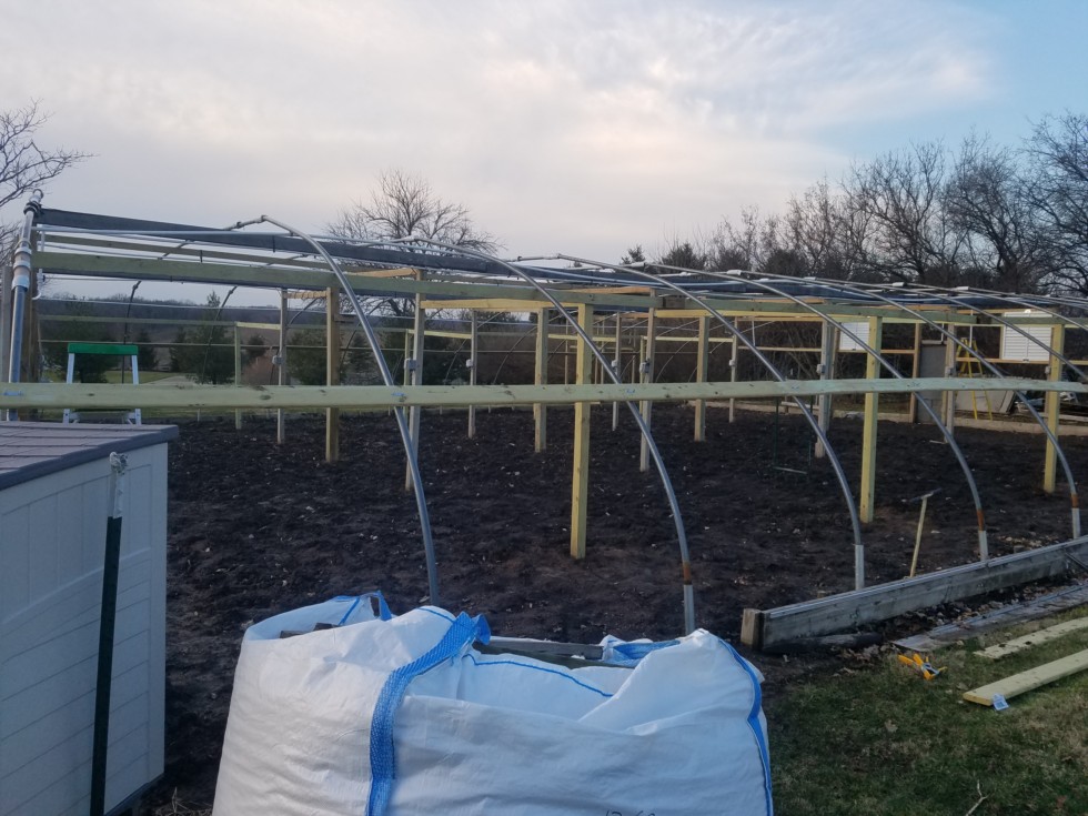 Rained most of the day, main reason going to a greenhouse. Got my side boards up on both sides. Plastic will go 56 ft over the middle end for end