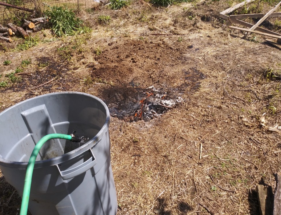 Want warm water? Two options fill a black barrel and let it sit in the sun all day. In the summer this can heat the whole barrel 80 degrees. Today Im running water slowly through a long hose exposed to the sun. I will drench the fire with this warm water. I may or may add compost tea or fertilizer to this water. The main problem with adding tea or fertilizer is (i think) a situation where the biologicals quickly do their thing eating nutrients and organics and then rob the soil of oxygen and create acidity. Its hard to create ideal conditions for roots instantaneously. But thats what I gotta try to do.