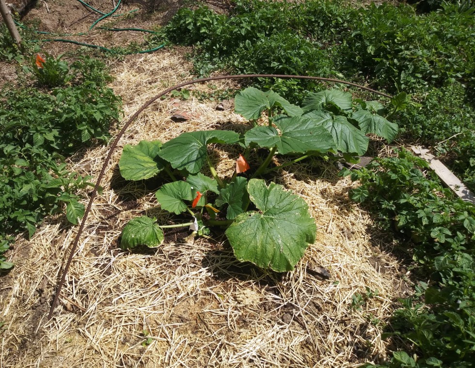 I liked this rebar over this plant. Keeps me from dragging a watering hose on the plant. Also its easy to throw a piece of plastic on it (then secure the edges of the plastic with boards or dirt). Hopefully wont have to do that any more covering since they are outgrowing all the setups, even this one is past the end of the rebar.