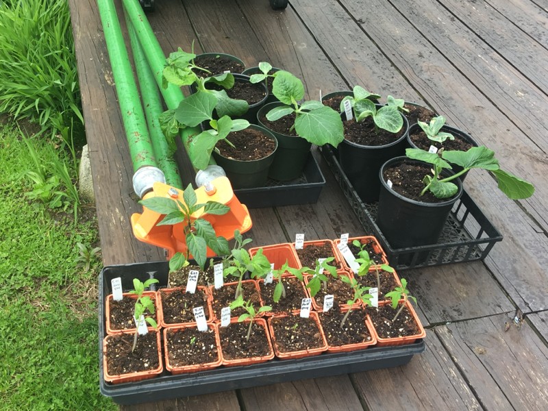 Here are our tomato and long gourd babies basking in the overcast skies. We like to harden both for a couple of days before plant out and cloudy days sometimes work best.