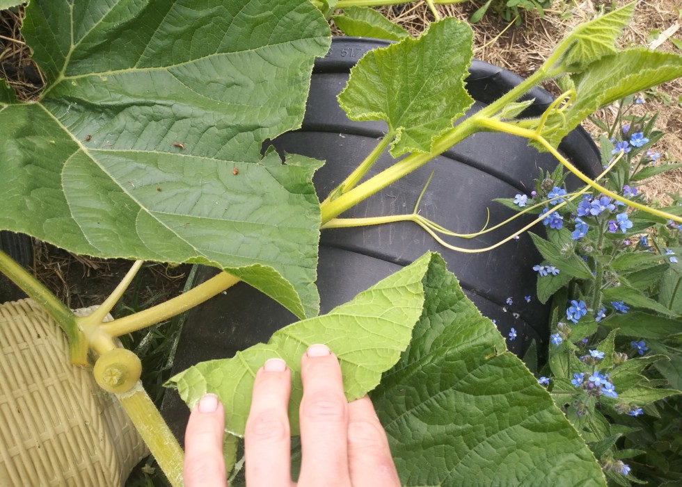 The growth of the secondary here is more dominant than I would like. It might not affect the pumpkin, but maybe it does. Hard to know. Some growers remove the leaf here because it will start to scratch and conflict with the pumpkin. I think its an important leaf but its certainly inconvenient especially when its directly under the pumpkin. An idea---it could be bent out of the way (likely w/damage to the stalk but cracked or bent leaves can still contribute) and staked/artificially supported, rather than completely removed. There is a whole spectrum of opinions some folks will hate this idea. Its just an idea. Really, I dont know what I am doing... I am just forwarding some ideas. Not the absolute truth---which some of us may be seeking---idk.