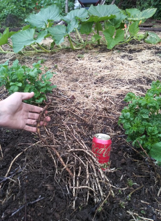 150 patch 1963.5 Stevens. This is what I mean by inadequate patch prep. These are bindweed roots. Including a momma bindweed root. Shovel breaks them which causes more starts. Four tine broadfork lifts them nicely out of the ground though!