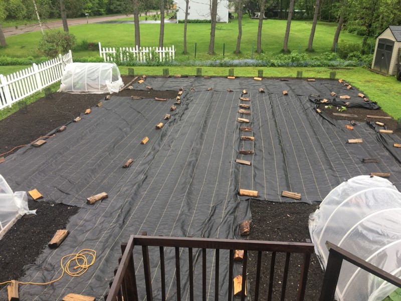 The new patch is a bit drier then the old but plants are still better to stay in hoops. We have planted giant sunflowers around the perimeter as well as tomatoes and long gourds.