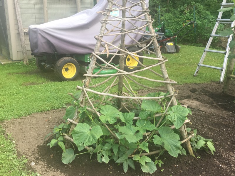 Giant cucumbers and long beans are starting to climb.