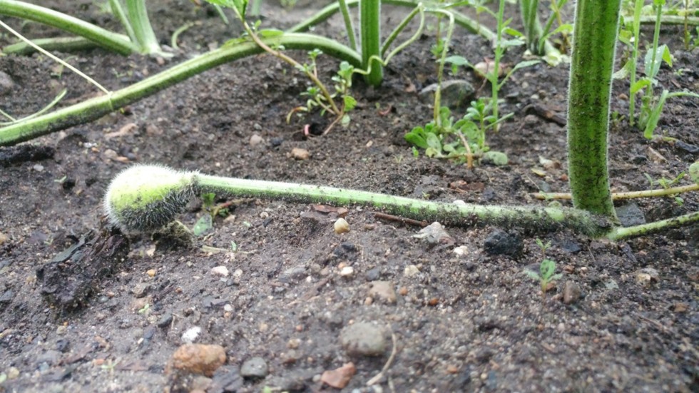 Bushel Gourds are stating to set. This is the 384.5xself. Incredibly long stems on these BG's. Guess I won't have any vine stress problems with this fruit.