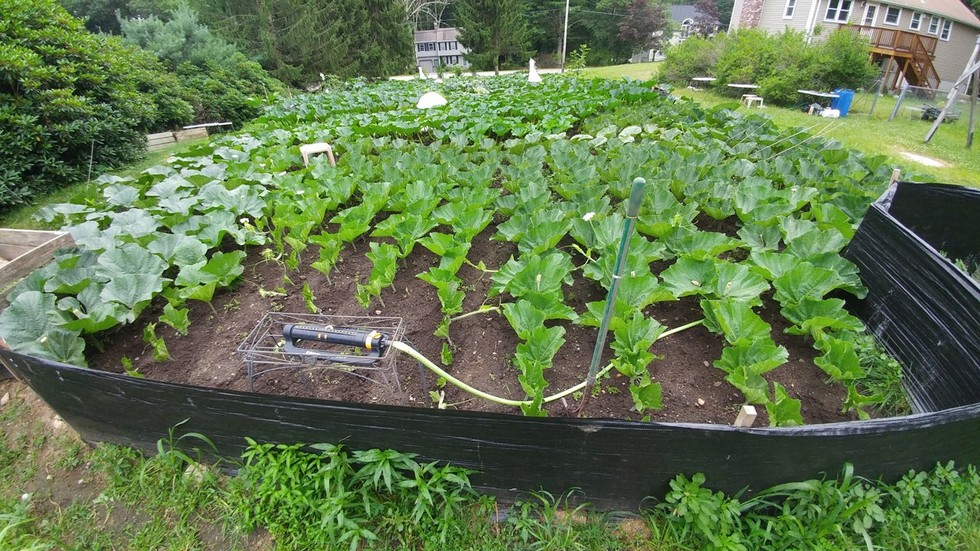 My patch is almost full. The 189.5 Fleming Bushel Gourd is closest, and there are 3 Atlantic Giant Pumpkin plants beyond that. There are 5 Giant Tomato's on the left.