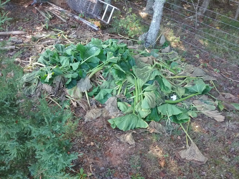 The bone pile. I've never seen anyone else show theirs on their diary, but if you are a grower just starting out in this hobby it may be the most important picture you see on my diary. It's a lesson that took me many years to learn, but proactive pruning and proper vine training are essential to keeping pumpkins going into the fall. Here in the south where powdery mildew thrives in our heat, humidity and heavy dews it vital to have your plants open to allow for good air circulation.