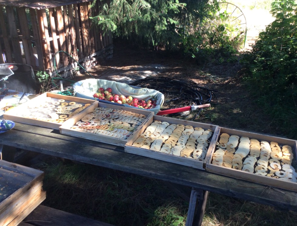Pumpkin seed drying trays work for apples. The apples look like donuts at a donut shop.