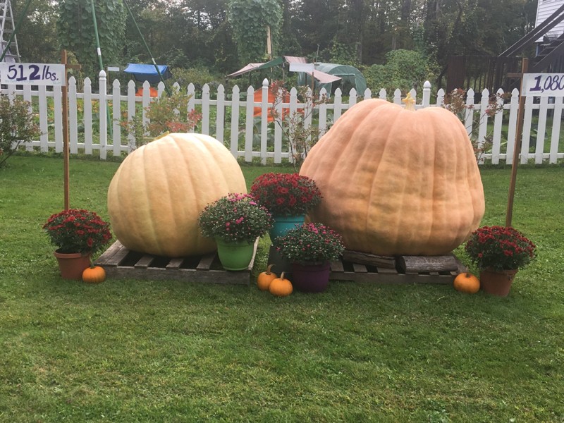 We had a fun day at the Vermont weigh off yesterday and came in 7th with big butted Rose weighing in at 1080 pounds. We also had to long gourds from our 132 Young measured which were 132.38 and 129.75. Here is the start of our display with Rose (1080 Young 19) on the right and Sophia (512 Young 19) on the left.