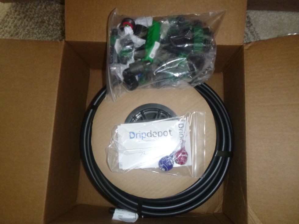 New Drip irrigation watering system I ordered arrived today. Last year's watering system of garden hoses/soaker hoses didn't work well because lack of water pressure. Last fall I timed how long it took to fill a 5 gallon pail to see how many gallons/hour I was getting from the faucet. The components I bought were based on that number. I should be able to put a row of drip tape alongside the main vine of every plant I am growing based on the GPH number . If it works, then I will continue to add rows of drip tape to fill in the rest of my growing area until I don't have enough water pressure to irrigate anything else.