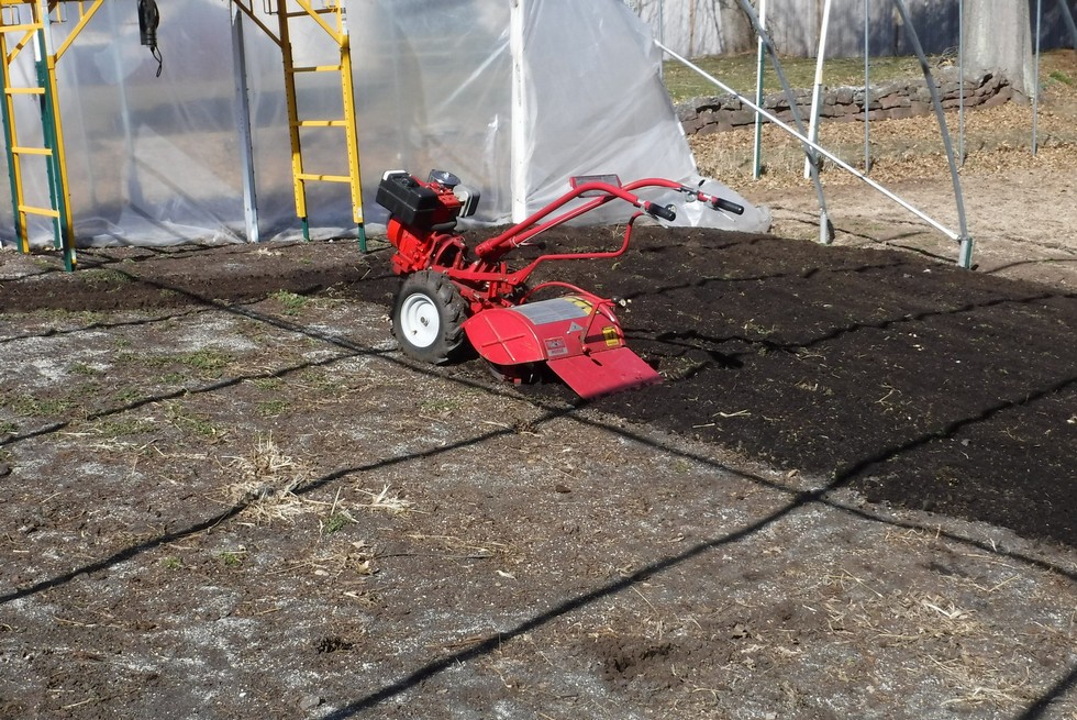 After a little reworking from a faulty switch at the end of last year�s tilling, this is back in action for one of its only two days of work for the year. Typically, tilling would be completed in just one day but there is a staggered start to this year�s growing season planned. The indoor plant site is the only one that has been amended to date and since the plant will be going in early to this site, it requires an early tilling.