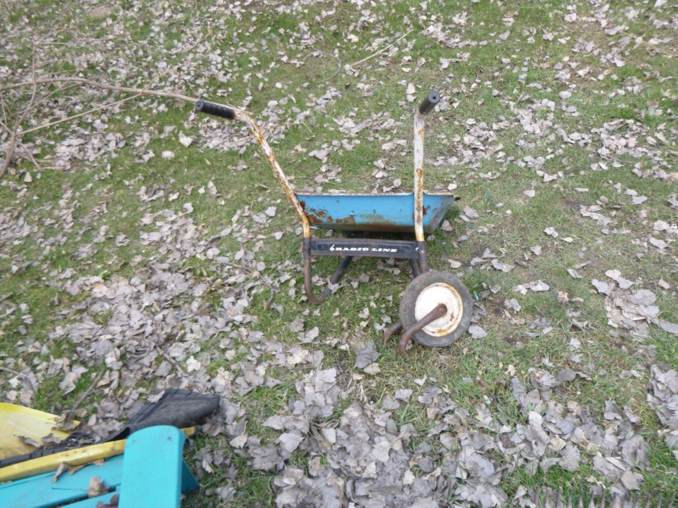 Wheelbarrow broke while hauling compost from my driveway to my patch. Note the brand is Radio Line. The wheel barrow was over 50 years old. It can't be an antique because it would have to be in pristine shape. Not lots of wear from years of use.