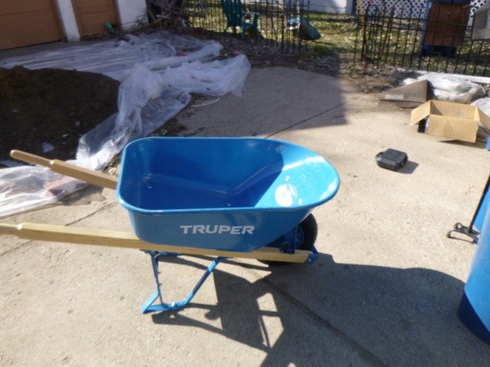 New wheelbarrow after assembling it. This one can hold 6 cubic feet of dirt. The old one could probably hold 3 cubic feet at the most. Less trips hauling compost from the driveway to the patch.