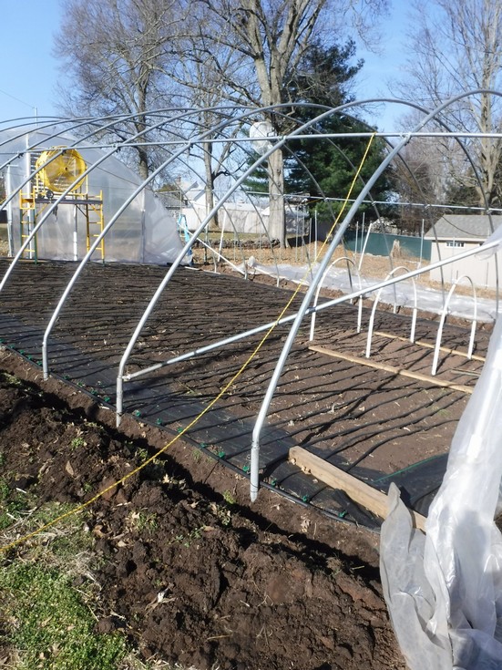 While the smaller cold frame and heating cables have already been installed it has been a game of �play the weather� to determine the �best� day to install the plastic to the structure. Well, today at 4:00pm is the time.