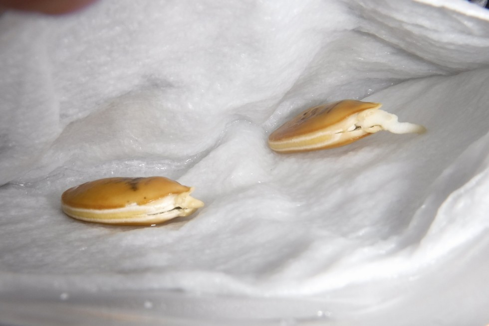 Both seeds have produced a radical which means germination has occurred. Now the next step is to transfer these seeds to media and wait on emergence. (*The seed on the rights is the keeper.)