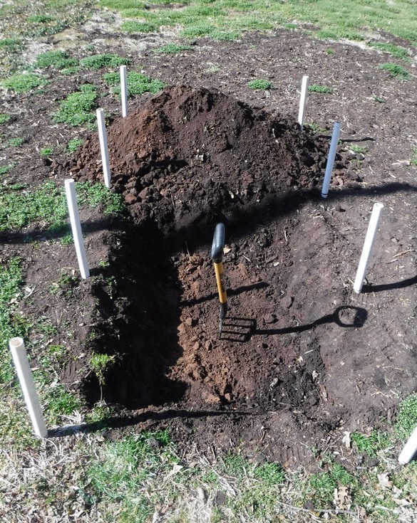 This is the process to bury soil heating cables. First a hole is dug that is about 5ft wide x 6ft long x 1ft deep. The cold frame structure supports are installed first to help ensure that 2/3 of the root zone will be heated.