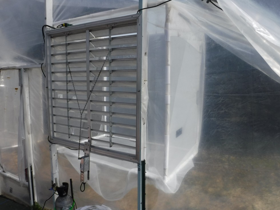 There is a Motorized Shutter Kit for 12-60 in. shutters, #1260 Motor that is rigged to a 48� (123cm) aluminum high velocity shutter vent (Specifically: Dayton 48� Backdraft Damper model # 4FZJ2). This is initiated by a thermostat that will open the shutters and also turn on the large 42� (107cm) (Dayton outdoor mobile air circulator) exhaust fan at the same time located on the opposite end of the structure.