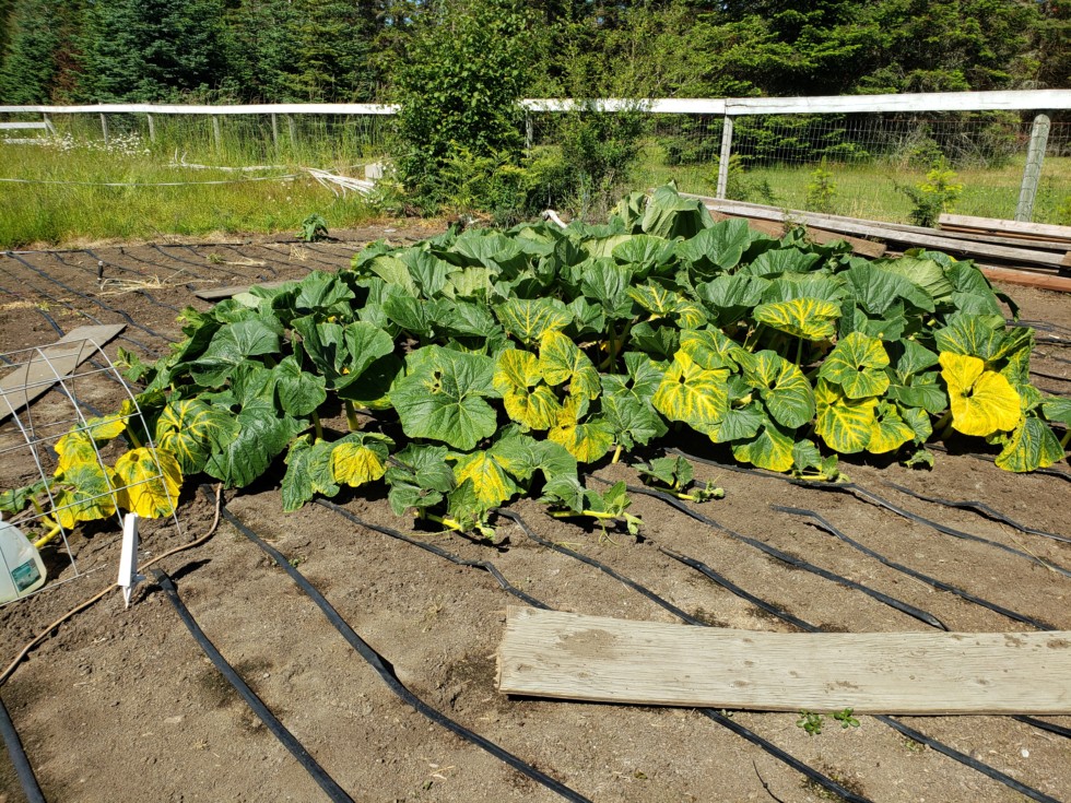 2517 Haist got REALLY yellow with the cool nights this week. Also to note it is an EXTREMELY compact plant with the shortest internodes I've ever seen. The leaves are smaller and thicker than "normal" and because of all of this it doesn't get sunburned. It has terminated 2 of it's own sidevines however. I really don't like the plant so far, but it might produce a really orange pumpkin judging by its extremely yellow vines.