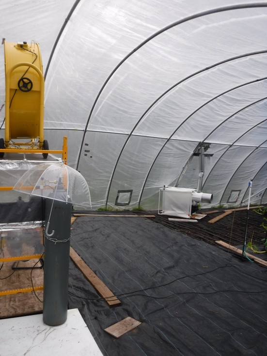 White Indirect Heater- This heater is also on a thermostat to help ensure the temperature does not dip below 50F (10C) even on the cold nights. This run off diesel fuel and produces only hot air as the exhaust is vented out the stove pipe outside the structure. This makes in the inside more pleasant for the pumpkin plant and grower compared to a traditional torpedo heater.