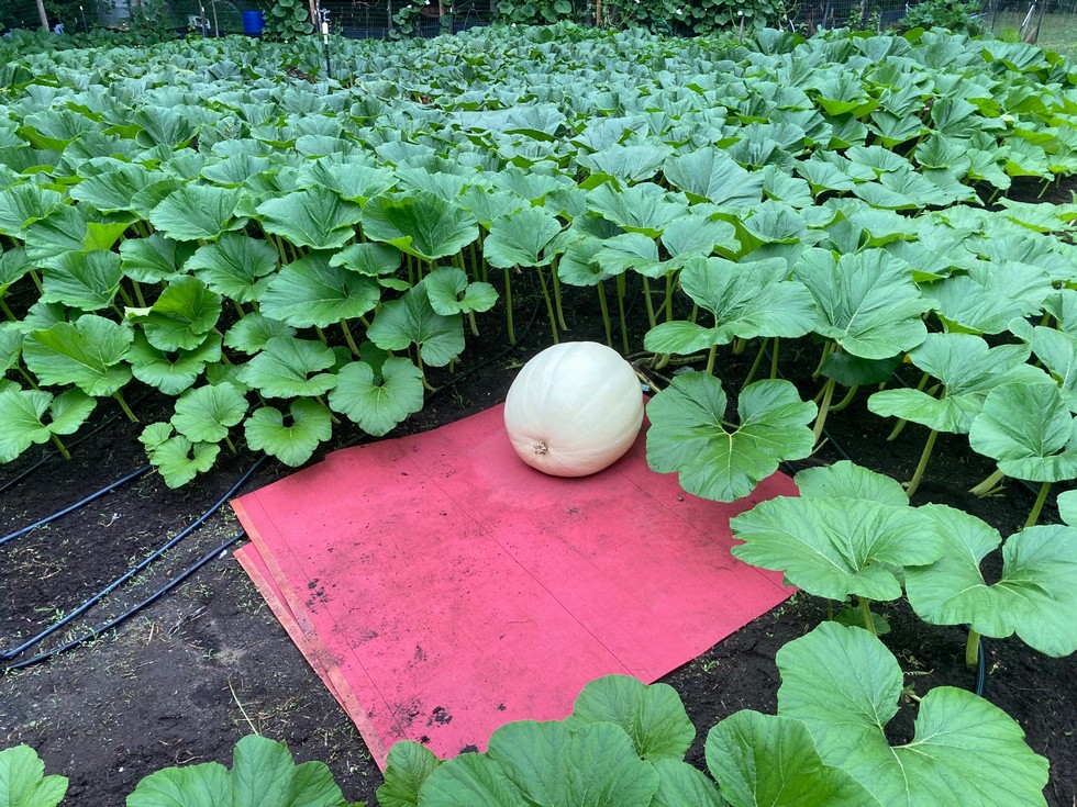 This is a 18 day old pumpkin pollinated on the 1450 on 6/19. I ended up removing the one I had pollinated on 6/12, just didn't have a good shape to it. This one is at about 23 feet out so it's got a big plant behind it.