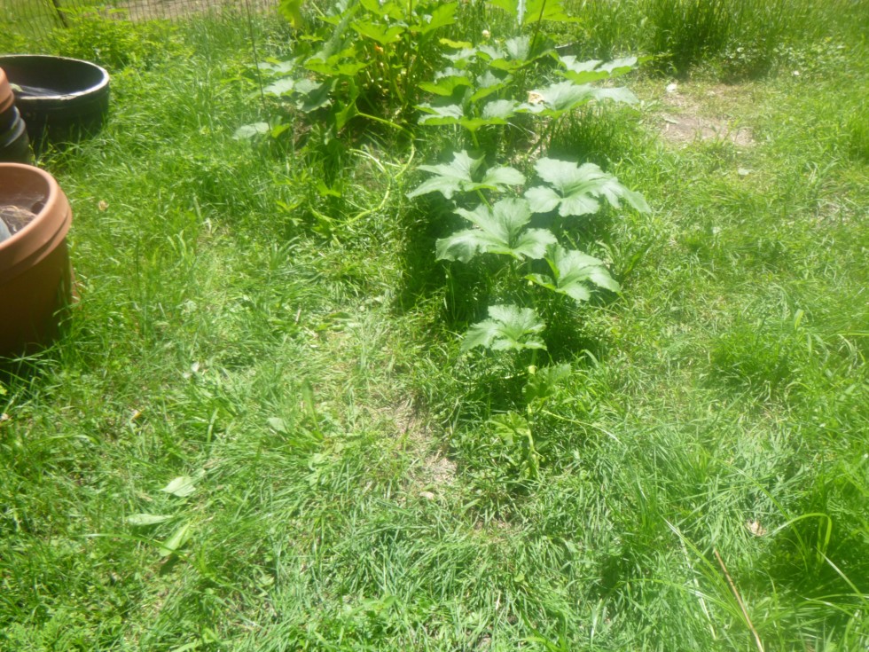 203 Fortey marrow plant. 3 vines now going south to north. Main vine 6 feet long. Vine 4 too small to start training to go south to north.