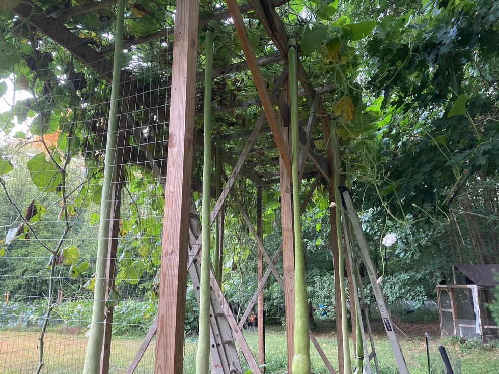 Despite the long gourd plants really taking a beating from the tropical storm winds we received a few weeks ago, somehow we've managed to have some good long gourds going.