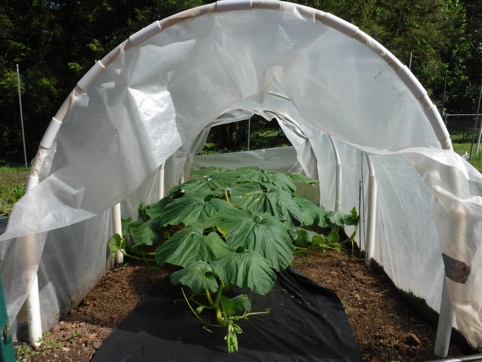 The outdoor plants' secondary vines are starting to touch the sides of the structure and so is the main vine. This means the plant is about 5ft wide and 9ft long and is ready to come out of the protective structure. The dimension of this enclosure are easy with purchased materials that need no modification and the width to length ratio is perfect to ensure no wasted space.