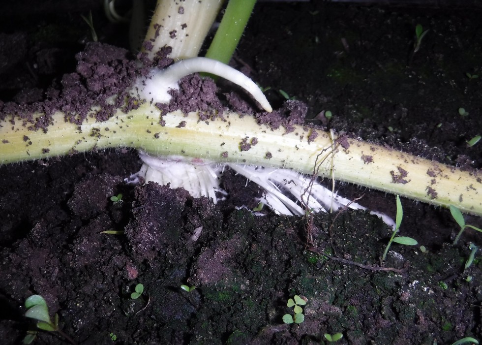 This vine recently was covered and the extent of the bottom root development is impressive. The top tap root has not had a chance to reach the soil line, but when the bottom root has that much surface area the plants ability to adsorb water and nutrients is very efficient. This high degree of efficiency may be a contributing factor to the crown foam issue.