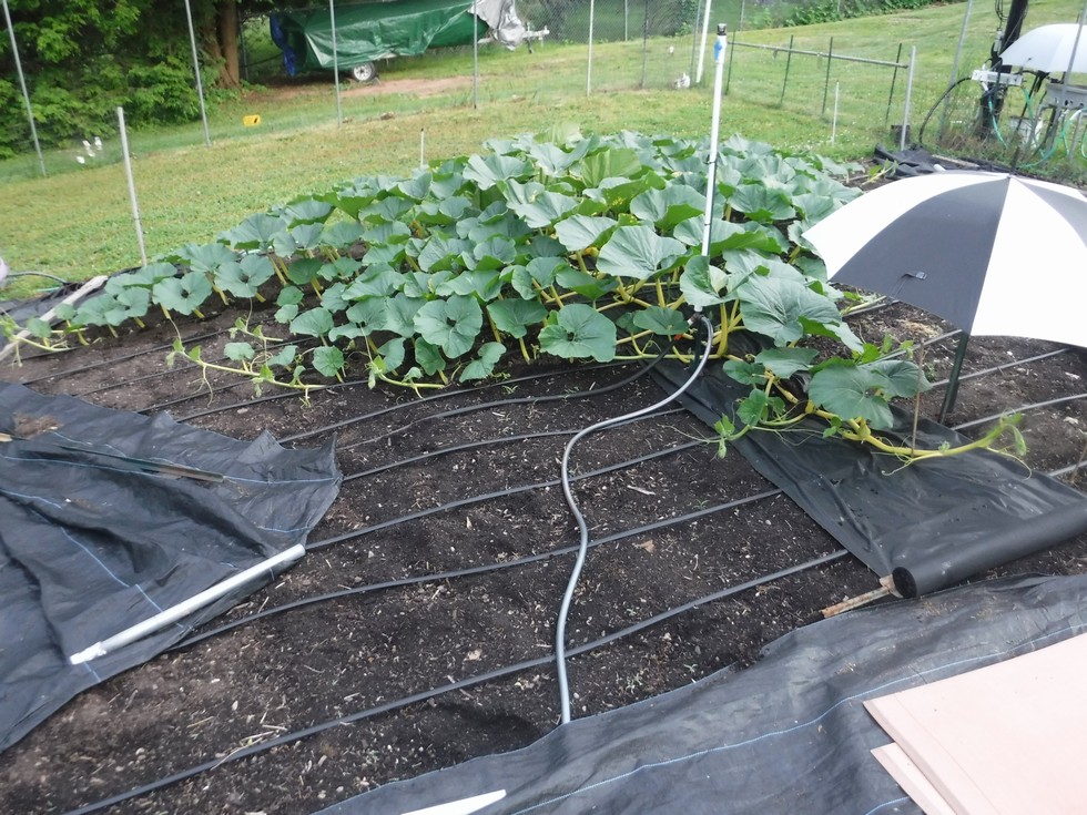 The large sections of weed block are removed as the side vines grow out but the 3ft wide section under the main vine will remain for the season. Also, one of two mister/sprinklers can be seen which will aid in plant cooling only. The drip tapes are what will be used as the source of irrigation.