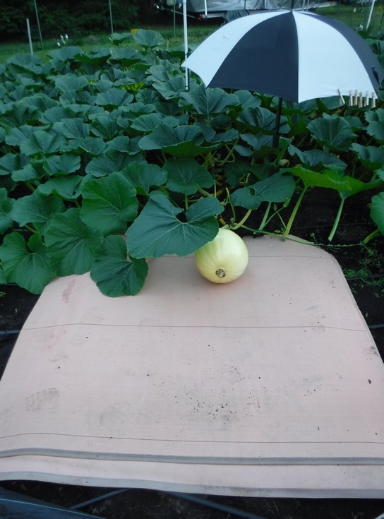 Get a double layer of mill fabric on the ground, then place �� plywood on top of that followed by a top double layer of mill fabric. The reason for these multiple layers is it will help make it easier to move the pumpkin later in the season if a situation develops.