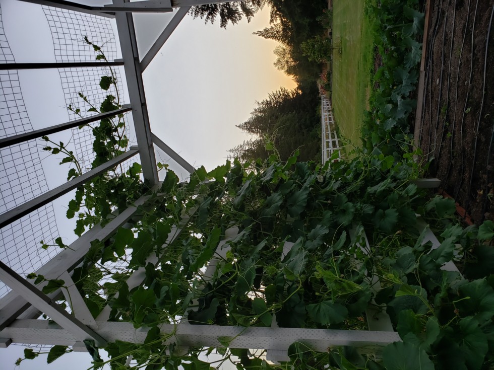 Long gourds are advancing across the top of the trellis!