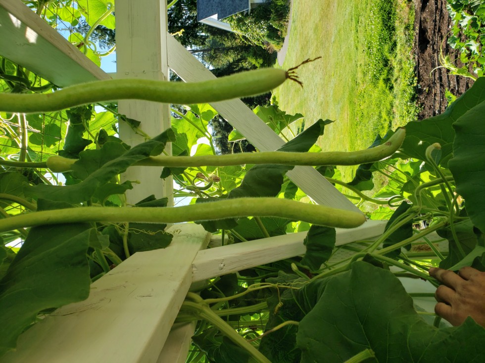 Long gourd culling day for the WR Laszic plant. On Todd Kline's advice, I am keeping the one in the far left closest to the backside of the trellis.