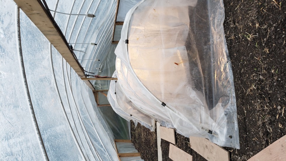 The hoops are electrified. Brooding lights and soil warming cables are gobbling up the juice.
