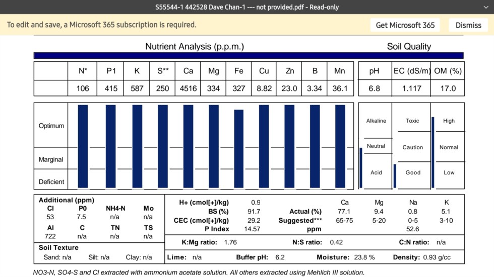 This year I learned how to use the Langley Soil Estimator through a YouTube hosted by Cecil Weston. It was a lot of fun learning the estimator and I would suggest you check it out. It's been 2 months since the 1st soil test and this was the result. To make it a little more interesting I took 10 soil samples from around the Chan 1379 plant. Since it was doing so well I wanted to see if it needed anything and the rest of the patch would be similar. As you can see the "too high" elements did not change and the estimator allowed me to not make things worse while improving the deficient elements. As I discussed before, I'm not using Western Labs because it took 2 weeks to get my results. I delivered my sample to the local lab and got my analysis in 36 hours. Kinda important when the plant is growing so fast....I think.