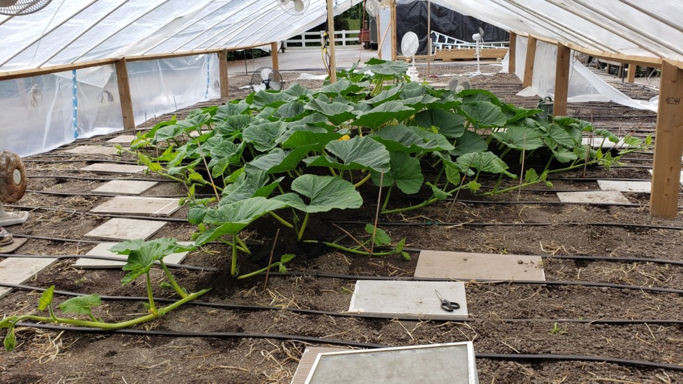 The Chan1379. 17 ft wide and 14 ft long. Should be pollinating #1 in a couple days. Lots of male flowers to do a selfie. This cooling off period of weather after a beautiful and hot May will let the burnt leaves heal a bit. Even with all the fans in the greenhouse, temperatures inside reached 96 deg F. I need misters !!