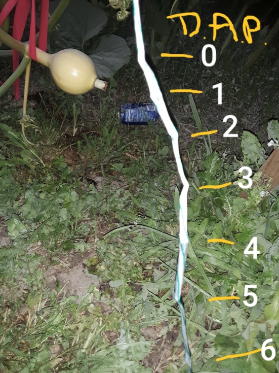 150 sq ft blossom down. Added the flagging tape for support. I cant support the pumpkin itself because I need the stem to bend and weight is what will (I hope) make it bend. This is not my first rodeo getting them to bend down isnt usually difficult but this one has such a formidable stem. The easy ones start to bend at DAP 4-5. Now at DAP 6 so this one may not be as easy. The growth is superb. Plant looks just fantastic. Weather forcast is super sunny.