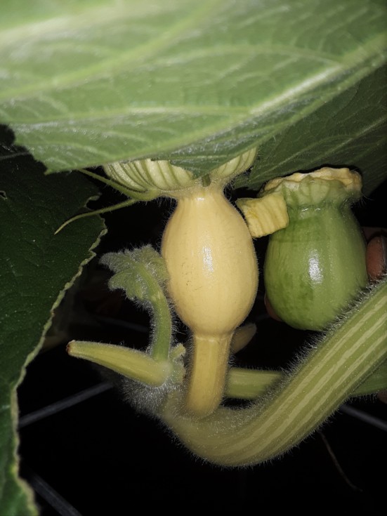 It's already longer than a well fed 1701 Jutras squash. And the squash here is 24 hours older. So it looks to me like the 1927.5 Daletas is a full-barrel shaped flower with the genetics to go heavy. This seems like a winning combo. I saw the 2469 in person and it had a nice barrel shape. Maybe it started like this? Because that's how it ended up.