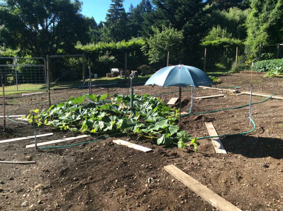 And yes, umbrellas in our patch mean only one thing, it�s pollination time!! The 2469 Daletas will be first, there are 2 pumpkins on the main that will be ready in 3-4 days and the other in about a week. Of course I�ll give both of them the rub and tickle, but I�m hoping the second one will be the chosen one just because it�s a little further out and will make things easier for plant maintenance and to re-install the rain/shade cover for the growing fruit.