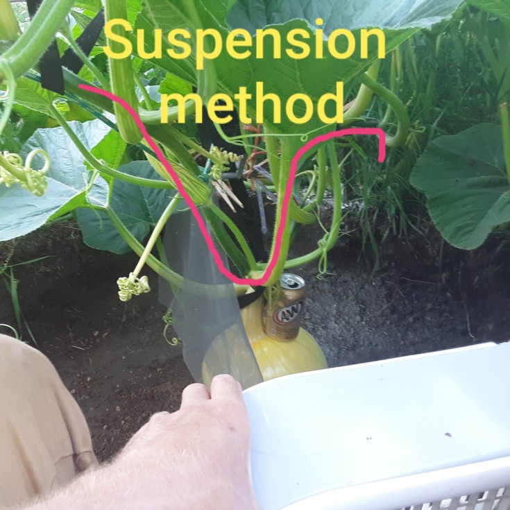 Vine path marked in pink. Pumpkin has enough room to get to 4 ft diameter. I'll have to make changes if its gonna get bigger than that. Blossom nub is tucked down into a small void in the dirt. Call me crazy... But I've never had the blossom nub rot even when stuck in the dirt. I guess I've got clean dirt. But later I may dig a hole under the pumpkin for ventilation, and blow sulfer under the pumpkin. (This might help if there was minor cracking where rot could get started.)