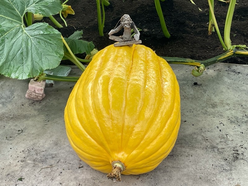 Here is our 1215 Young. This plant always seems to throw something unique at us. This is a very long very �ridgey� pumpkin. We have had long pumpkins but never long with lots of ridges. Early looks are trending towards a dark orange too.