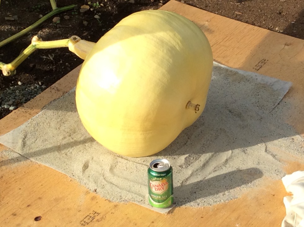 Stem end looking good, blossom end looking good and minor adjustment made with sand to lower the stem angle and start with the blossom end and stem end more equidistant. We have an �oh shit� (backup) pumpkin pollinated on a really good secondary and will wait it out to see who becomes queen of the Wallace plant.