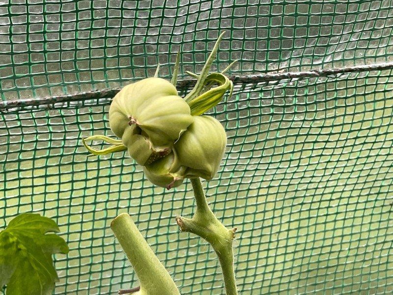 Here is a mega bloom on the 6.55 Porkchop at about 6 feet up the plant. Our 5 gallon bucket tomato is still growing and has a cc of 13.5 inches.
