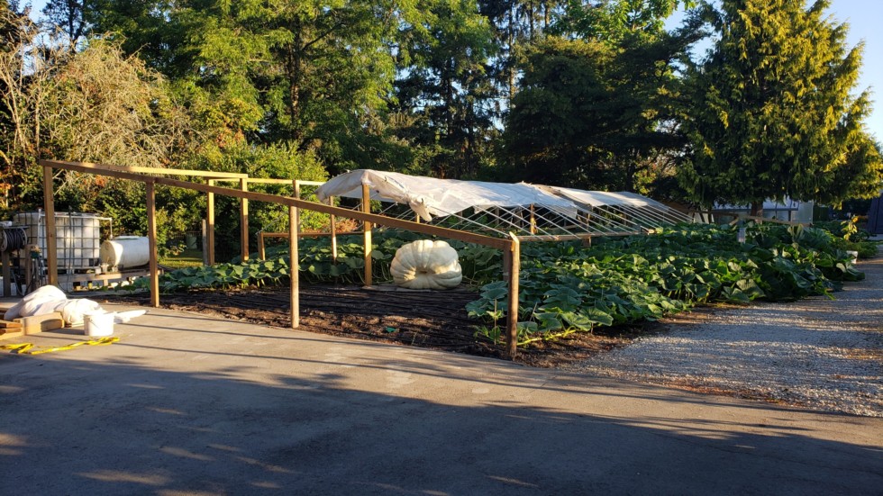 Barron 2118 DAP 40 OTT 330 I've building a frame to support a sheet of greenhouse poly to cover the whole patch when night time temperatures start to fall. Hopefully this will extend the growing season of the pumpkins.