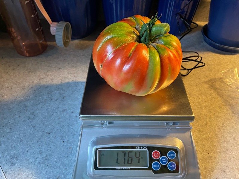 We picked the 5 gallon bucket tomato. Just 1.76 pounds but at least we got one to the scale this year!