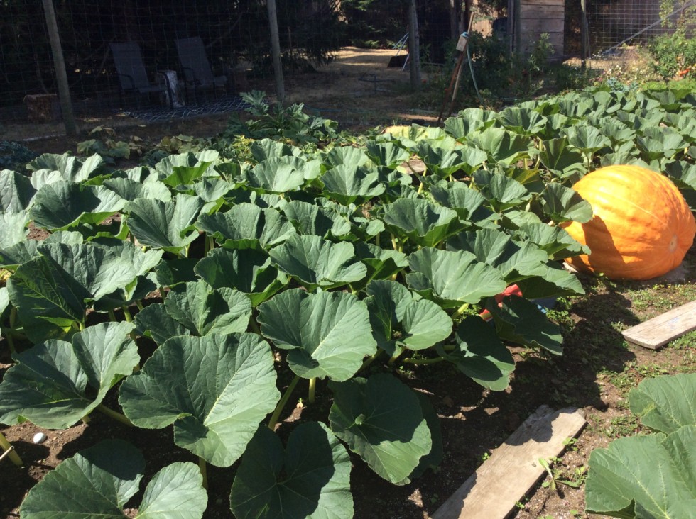 By far, the healthiest, and easiest care plants have been the prizewinners. Here is the plant with a pumpkin at 6 feet on the main and there are only 4 secondaries on each side, about 15 feet long each. This size plant is supporting 2 fruit at 200 + pounds each.