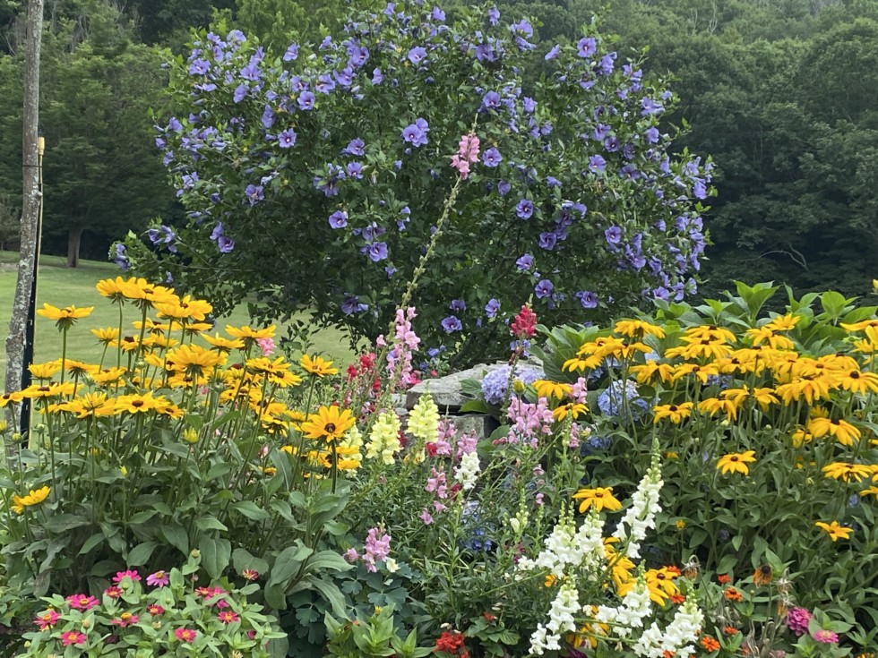 Blue satin rose of Sharon in the background. If the rose of Sharon is in bloom you should be picking your early sweet corn. Just something I have noticed over the years. The technical term for that kind of observation is called phenology.
