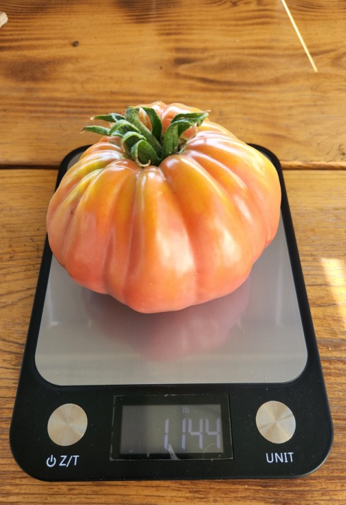My 1st giant tomato on a scale. 7.19 Tobeck. Single blossom. On our food scale it weighs 1.14lbs