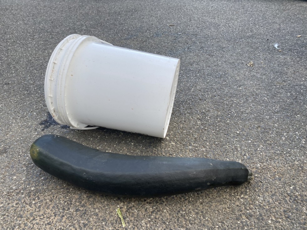 A fordhook zucchini. I brought this one to the fair and entered it in the heaviest zucchini contest. It won first place. It is probably not worth getting seeds from it as it was grown next to some field pumpkins
