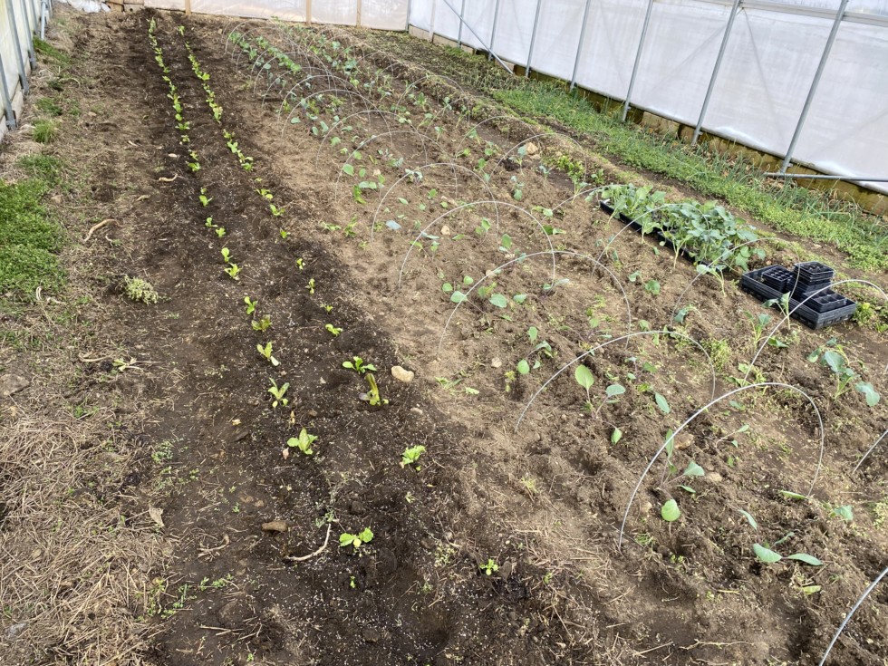 Spring begins a month or two early in the high tunnel from left to right lettuce cabbage and broccoli potatoes and �Bridger� overwintering onions